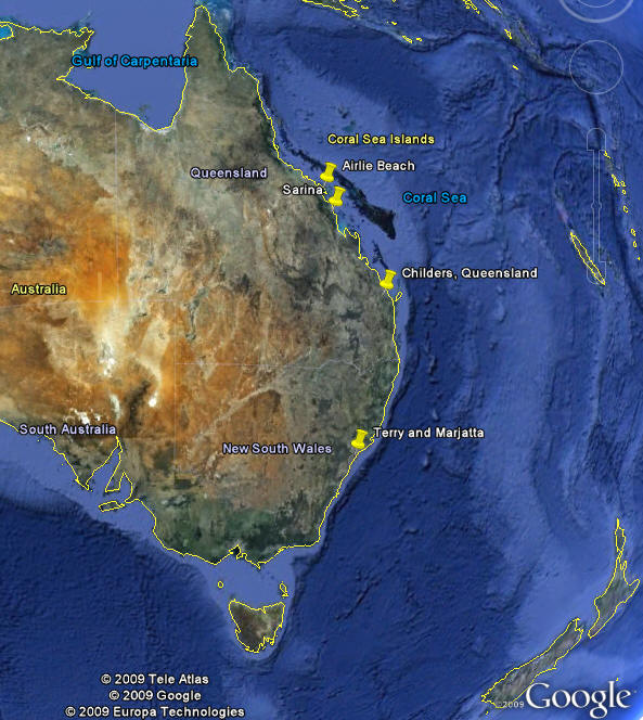 The land along the coast was dry due to a lack of rain. There were many fires along the coast especially in Queensland. The bush along the road was still smoldering in several areas. There were many signs along the way that warned of kangaroos. The kangaroos are most active at dusk and dawn so we avoided driving at that time. Apparently they rest in the shade during the day and move about when it cools down. In some areas adjacent to bush areas there were quite a few dead kangaroos along the road. The large trucks which travel all night have metal grills on the front of their trucks so when they hit a kangaroo little damage is done to the truck. There was some agriculture especially sugar cane which was irrigated. Along the coast are miles of narrow gage rail lines that are used to transport the cane. Day 14 we arrive in Airlie Beach a major tourist area. S 20.27 E 148.70. We stayed five nights in order to spend time visiting the Great Barrier Reef and the Whitsunday Islands.