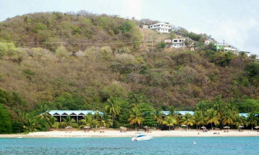 We spent two nights in Canouan before heading to Mayreau. Mayreau has little development on it. There is a small town on the hillside and a small resort on the north end of the island in Saltwhistle Bay. We anchored in Saline Bay on the south end of the island. Saline Bay is the main access for the island. The dock in the north end of the bay is where the supplies arrive via the ferry. Do not anchor too close to the dock. While we where there, an anchored boat was rudely awakened early in the morning by a very insistent ferry horn. Their anchor was raised very quickly. Dennis’ Hideaway is up the hill on the opposite side of the road from the house with the pink roof. The church is at the very top of the hill and has great views of the islands. The beach along Saline Bay is sandy and picturesque and looks deserted. However, one day a week a cruise ship comes in and food and tee shirt vendors appear like magic.
