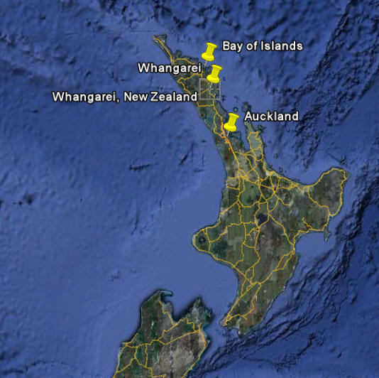 New Zealand Day 3 We picked up our camper today; a two process so we did not get on the road until noon and headed north toward the Bay of Islands (120 miles north of Auckland). Almost immediately after leaving the suburbs of Auckland, we were into the famous green mountains of New Zealand. That first night we stayed in Whangarei (E 174 degrees 19.2.minues S 35 degrees 43.5 minutes). In Maori the Wh in Whangarei is pronounced like a P.