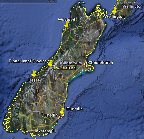 New Zealand Day 15 We left Haast and headed east back across the island toward Dunedin thru the Haast pass in the Southern Alps. We were in the mountains as soon as we left Haast. Once through the mountains we were again in an area with hills and a lot of farming. Fortunately the day was sunny for our trip thru the pass in the alps. As it was still spring snow showers could be encountered in the passes.