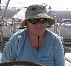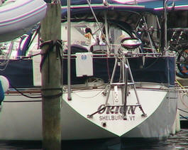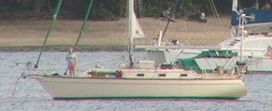 heading right for Grenada. Originally we had planned to bypass Grenada and head for Union Island, but since we had no chance of making Union before dark we tacked for Grenada and anchored a couple miles north of Saint George at Grand Mal Harbor, put up the quarantine flag, had lunch and then a long afternoon siesta. That night before we went to sleep, Linda and I tally up our bruises, especially the backside ones each of us can't see, but only feel. Linda does have a pretty purple little toe on one foot. Saturday We left early the next morning for Union Island. The winds and seas lessen somewhat, but not much. Saw lots of flying fish, but their glide paths kept getting shorten when they would run into the next rising wave. Arrive Union late afternoon. Were quite happy to have a boat vendor come out this late to try to rent us a mooring, we take it and he leads us in. Clifton Harbor is protected on the windward side by a reef and there is a smaller reef in the middle of the harbor, not a fun place to set anchor as it is getting dark.