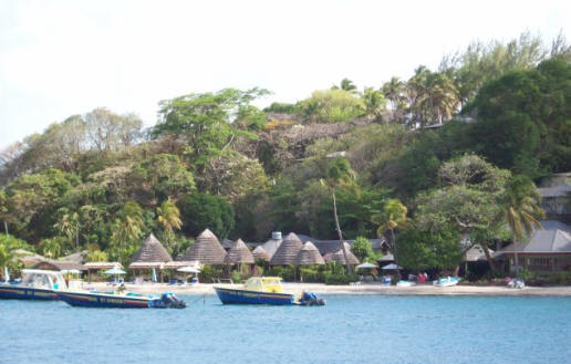 Young Island is home to a very lovely resort and the dome shaped island south of Young Island is Ft. Duvernett which still have cannon on the top that were used during the wars between the English, French and the Caribs. The fort was built around 1800 with the fort built 190 feet above the sea to defend the shore. There were two batteries on the island one facing the sea and one facing the mainland. One was on top and the other 40 feet below. They each had 24-pound guns and 8 inch mortar. On the mainland side of Young Island Cut is restaurant row with many choices of food. We went to the Xcape for lunch and the next day to Lime Restaurant and Pub (again) for an excellent dinner. Of course we stopped at the Young Island Resort for sundowners one day.